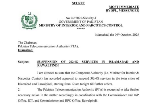 وفاقی وزارتِ داخلہ نے سیکیورٹی خدشات کے پیشِ نظر راولپنڈی اور اسلام آباد میں موبائل انٹرنیٹ سروسز غیر معینہ مدت کے لیے معطل کرنے کا نوٹیفیکیشن جاری کردیا۔