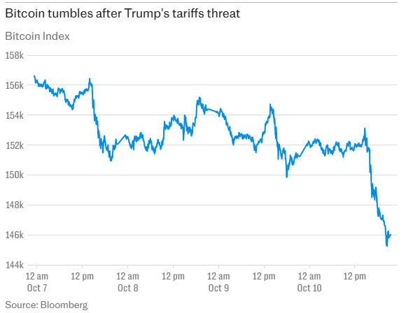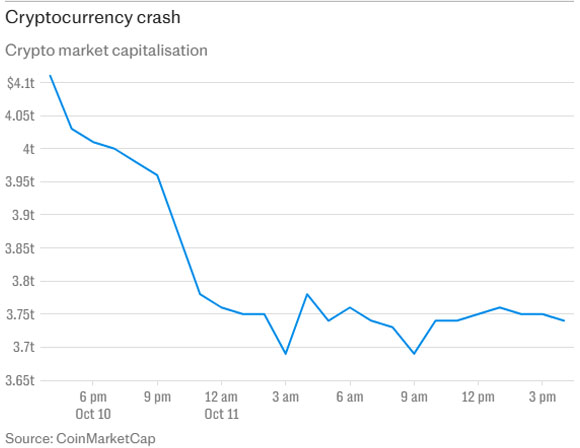 ڈونلڈ ٹرمپ کی جانب سے چین پر نئے 100pc ٹیرف لگانے کے اعلان نے تاریخ کے سب سے بڑے کرپٹو کرنسی کریش کو جنم دیا ہے اور اگلے ہفتے عالمی منڈیوں میں افراتفری کا خدشہ پیدا کر دیا ہے۔