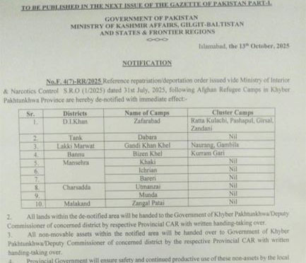 وفاقی حکومت نے خیبر پختونخوا میں کئی دہائیوں سے قائم افغان پناہ گزین کیمپوں کو فوری طور پر ختم کرنے کا باضابطہ نوٹیفکیشن جاری کر دیا ہے۔ فیصلے کے مطابق صوبے کے مختلف اضلاع میں موجود تمام افغان مہاجرین کیمپوں کو مرحلہ وار بند کیا جائے گا۔