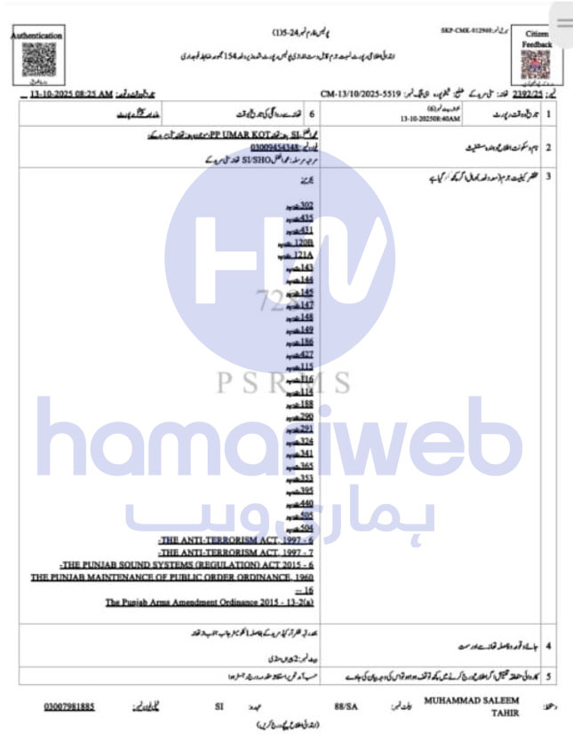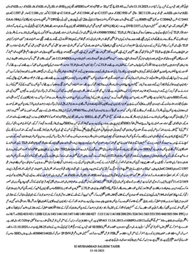 ضلع شیخوپورہ کے تھانہ سٹی مریدکے میں درج ایف آئی آر 2392/25 کے مطابق واقعہ صبح تقریباً ساڑھے تین بجے پیش آیا، جب پولیس اہلکار سیکیورٹی پلان کے مطابق جی ٹی روڈ پر تعینات تھے۔ اس دوران مذہبی تنظیم کے تقریباً تین سے ساڑھے تین ہزار کارکنان ڈنڈوں، سوٹوں، پتھروں اور اسلحہ کے ساتھ جلوس کی شکل میں موقع پر پہنچے۔