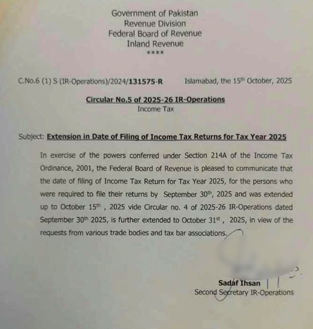 فیڈرل بورڈ آف ریونیو نے ٹیکس گوشوارے جمع کرانے کی تاریخ میں مزید 16 دن کی توسیع کر دی۔