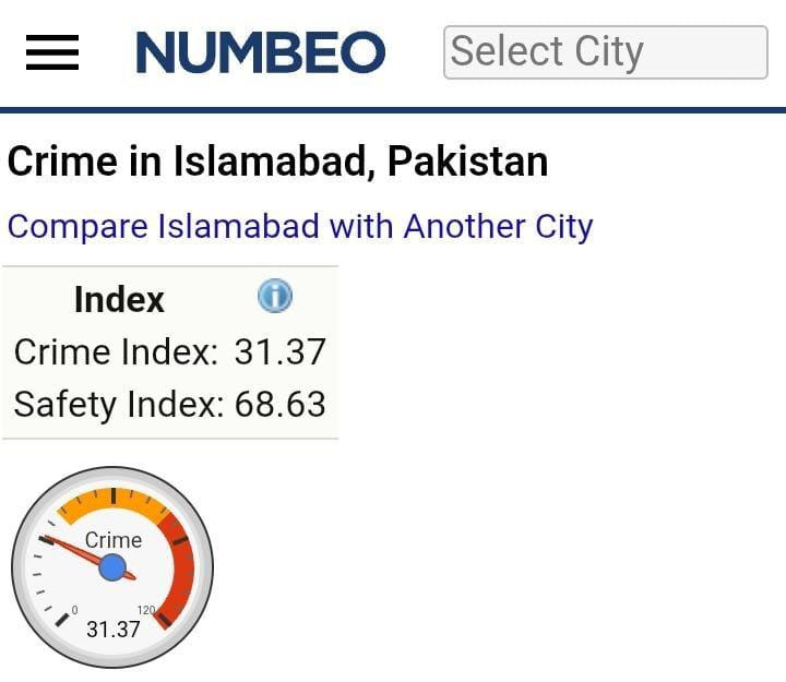 کرائم ریٹنگ رپورٹ کے مطابق اسلام آباد میں کرائم انڈیکس 31.37 فیصد اور سیفٹی انڈیکس 68.63 فیصد ریکارڈ کیا گیا ہے۔ مجموعی طور پر شہر میں جرائم کی شرح 29.01 فیصد تک محدود ہو گئی ہے۔