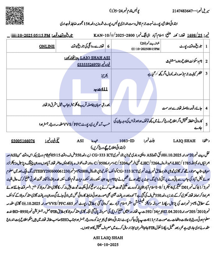 ایف آئی آر کے مطابق، فیض آباد چیک پوسٹ سے سوہان کی سمت آنے والی گاڑی پر اسلام آباد کی نمبر پلیٹ CG-333 لگی ہوئی تھی، ڈرائیور کی جانب سے گاڑی کے ملکیتی دستاویزات پیش نہ کرنے پر پولیس نے مشکوک گاڑی کو قبضہ میں لیا۔
