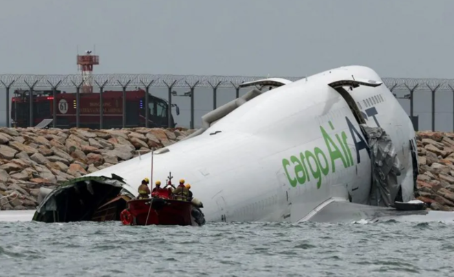 ہانگ کانگ کے ہوائی اڈے پر پیر کے روز ایک کارگو طیارہ لینڈنگ کے دوران رن وے پر موجود ایک گاڑی سے ٹکرا کر سمندر میں جا گرا، جس کے نتیجے میں گراؤنڈ عملے کے دو ارکان ہلاک ہو گئے۔