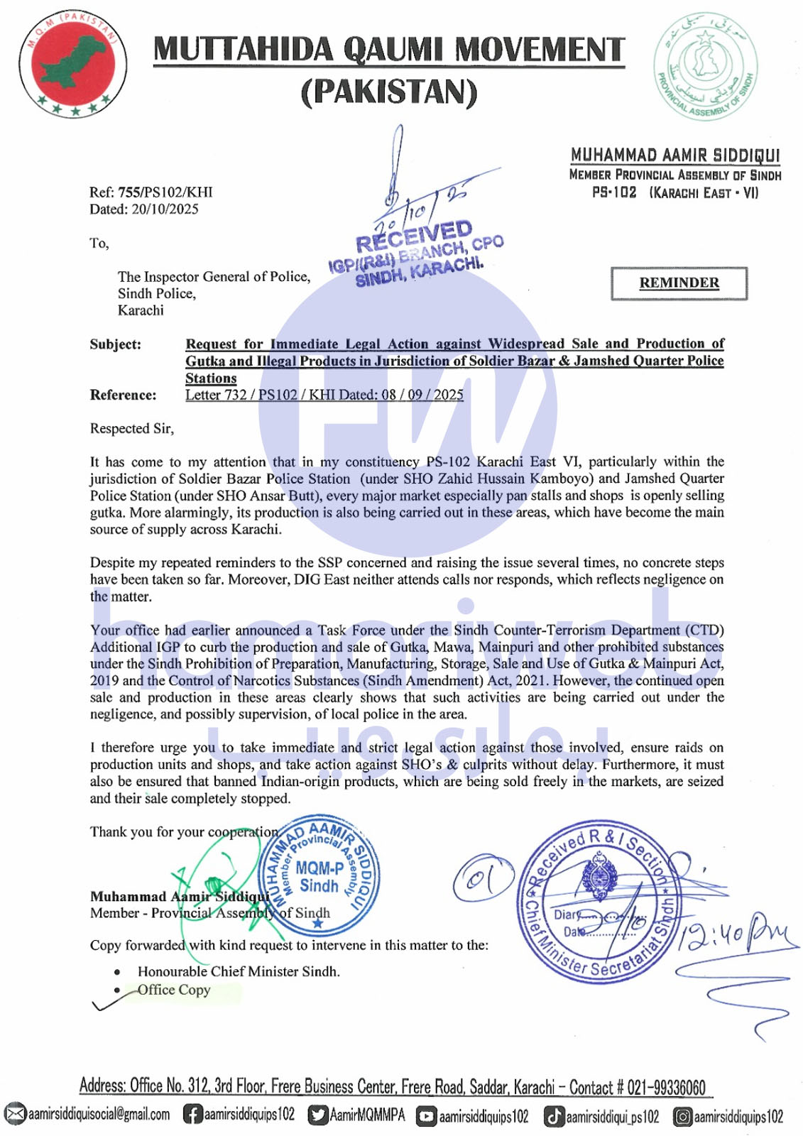 کراچی شرقی کے حلقہ پی ایس 102 سے منتخب ایم پی اے محمد عامر صدیقی نے خط میں لکھا کہ تھانہ سولجر بازار جہاں ایس ایچ او زاہد حسین کمبویو اور تھانہ جمشید کوارٹرز جہاں ایس ایچ او انصر بٹ تعینات ہیں، مذکورہ دونوں تھانہ جات کی حدود میں واقع تمام مارکیٹوں بالخصوص پان کی دکانوں پر کھلے عام گٹکا ماوا فروخت کیا جارہا ہے، جبکہ شہر کے مختلف علاقوں میں بھی سپلائی جاری ہے۔