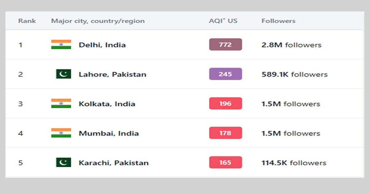 بھارتی دارالحکومت نئی دہلی دنیا کے آلودہ ترین شہروں کی فہرست میں پہلے نمبر پر آگیا ہے جہاں دیوالی کے موقع پر کی گئی آتش بازی کے باعث فضائی آلودگی خطرناک حد تک بڑھ گئی۔ عالمی خبر رساں اداروں کے مطابق نئی دہلی کا ایئر کوالٹی انڈیکس 772 تک جا پہنچا ہے جو انسانی صحت کے لیے انتہائی مضر سطح تصور کیا جاتا ہے۔