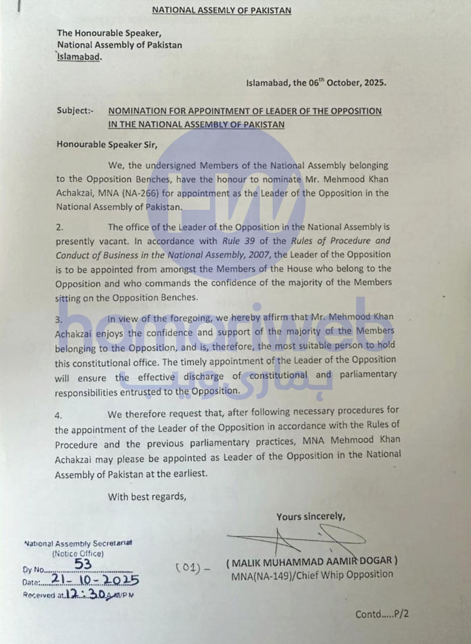 ذرائع کے مطابق اس سلسلے میں درخواست قومی اسمبلی کے اسپیشل سیکریٹری کو جمع کرا دی گئی ہے۔ ذرائع کا کہنا ہے کہ پی ٹی آئی کے پارلیمانی وفد نے اسپیشل سیکریٹری کو اپوزیشن لیڈر کی نامزدگی سے متعلق تحریری درخواست جمع کراتے ہوئے مؤقف اختیار کیا کہ محمود خان اچکزئی ایوان میں اپوزیشن کی نمائندگی کے لیے بہترین امیدوار ہیں اور وہ تمام اپوزیشن جماعتوں کے ساتھ رابطے میں رہیں گے۔