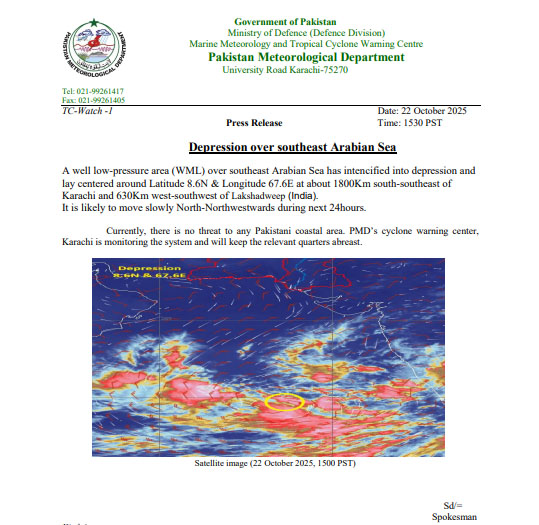 محکمہ موسمیات کے مطابق بحیرہ عرب کے جنوب مشرق میں ہوا کا کم دباؤ ڈپریشن میں تبدیل ہو رہا ہے، ڈپریشن کا مرکز 8.6 شمالی عرض البلد اور 67.6 مشرقی طول البلد پر واقع ہے۔