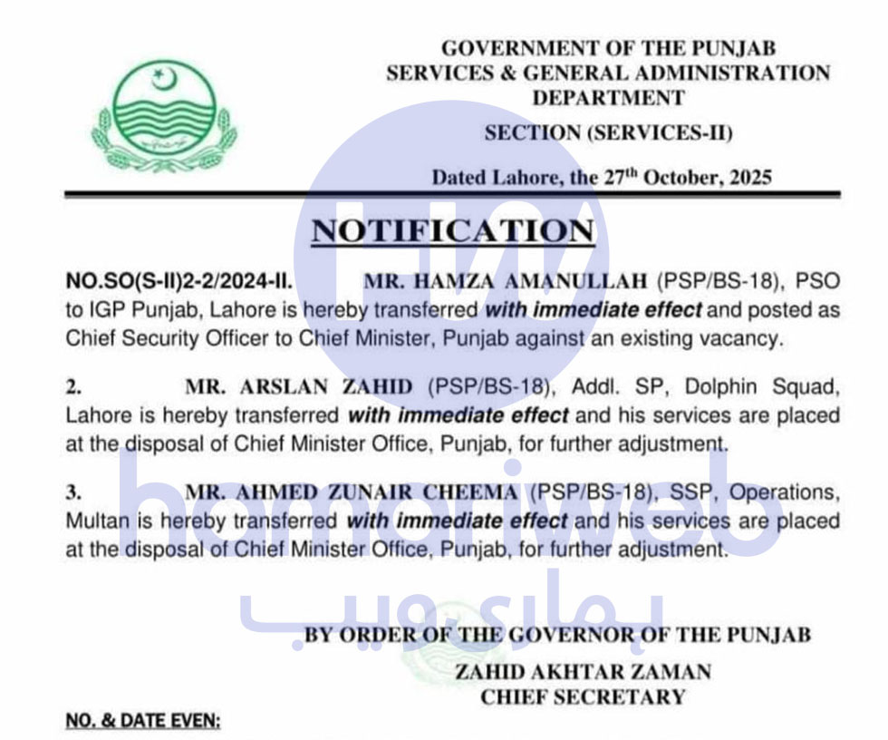 نئے سیکیورٹی سیٹ اپ میں ایس پی ارسلان زاہد اور ایس پی احمد زنیر چیمہ کو بھی وزیراعلیٰ کی سیکیورٹی ٹیم میں شامل کرلیا گیا ہے۔