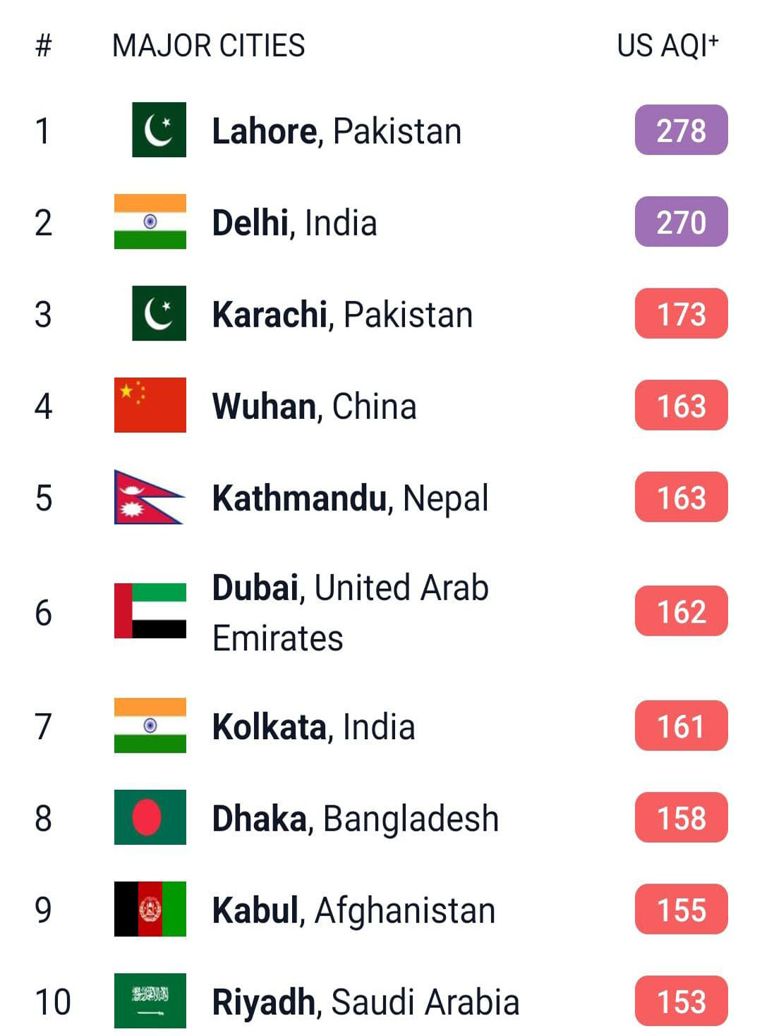 ایئر کوالٹی انڈیکس کے مطابق دنیا کے آلودہ ترین شہروں کی فہرست میں لاہور پہلے نمبر پر پہنچ گیا جبکہ کراچی تیسرے نمبر پر آگیا۔ دہلی فہرست میں دوسرے نمبر پر موجود ہے۔