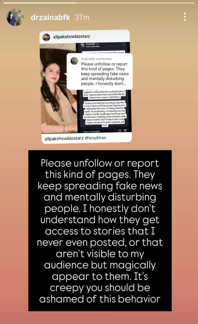 اب یہ معاملہ دوبارہ توجہ کا مرکز بن گیا ہے۔ سوشل میڈیا پیج’’شہاب حسین صدیقی بلاگز‘‘ نے ایک دعویٰ سامنے رکھا ہے کہ ڈاکٹر زینب کی جانب سے مبینہ طور پر انسٹاگرام پر ایک اسٹوری پوسٹ کی گئی جس میں انہوں نے فیروز خان سے علیحدگی کا اعلان کیا۔ مبینہ اسٹوری کے مطابق ڈاکٹر زینب نے لکھا کہ وہ ایسے شخص کے ساتھ مزید زندگی نہیں گزار سکتیں جو ان پر اعتبار نہ کرے۔ ان کے مطابق فیروز خان کے رویے نے تمام اچھی یادوں پر سایہ ڈال دیا ہے اور وہ اس وقت پرائیویسی چاہتی ہیں۔ یہ پوسٹ کچھ دیر بعد ان کے اکاؤنٹ سے ہٹا دی گئی۔
