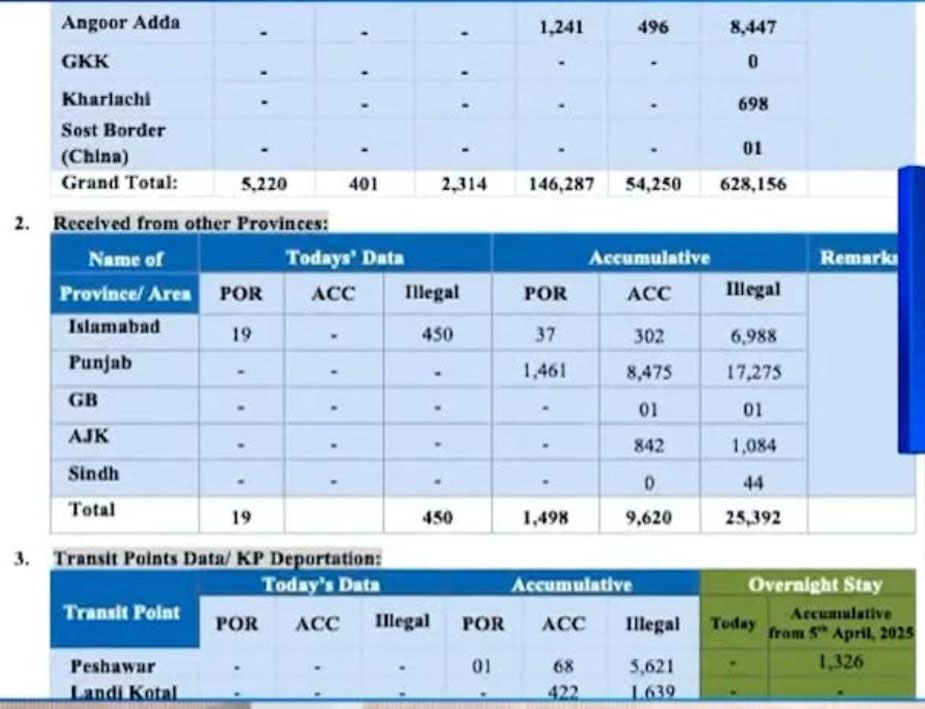 ذرائع کے مطابق خیبر پختونخوا کے مختلف ٹرانزٹ پوائنٹس سے 19 افغان شہری ڈی پورٹ کیے گئے، جبکہ اسلام آباد سے بھی 19 اور پنجاب سے 450 افغان شہریوں کو گزشتہ روز وطن واپس بھیج دیا گیا۔