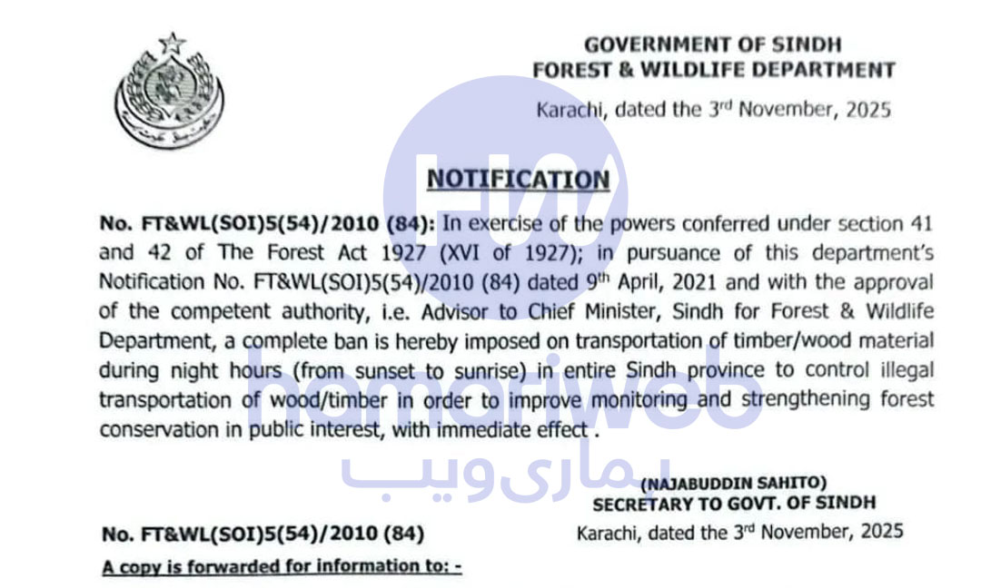 حکومتِ سندھ نے اہم فیصلہ کرتے ہوئے رات کے وقت لکڑی کی نقل و حمل پر مکمل پابندی عائد کردی۔