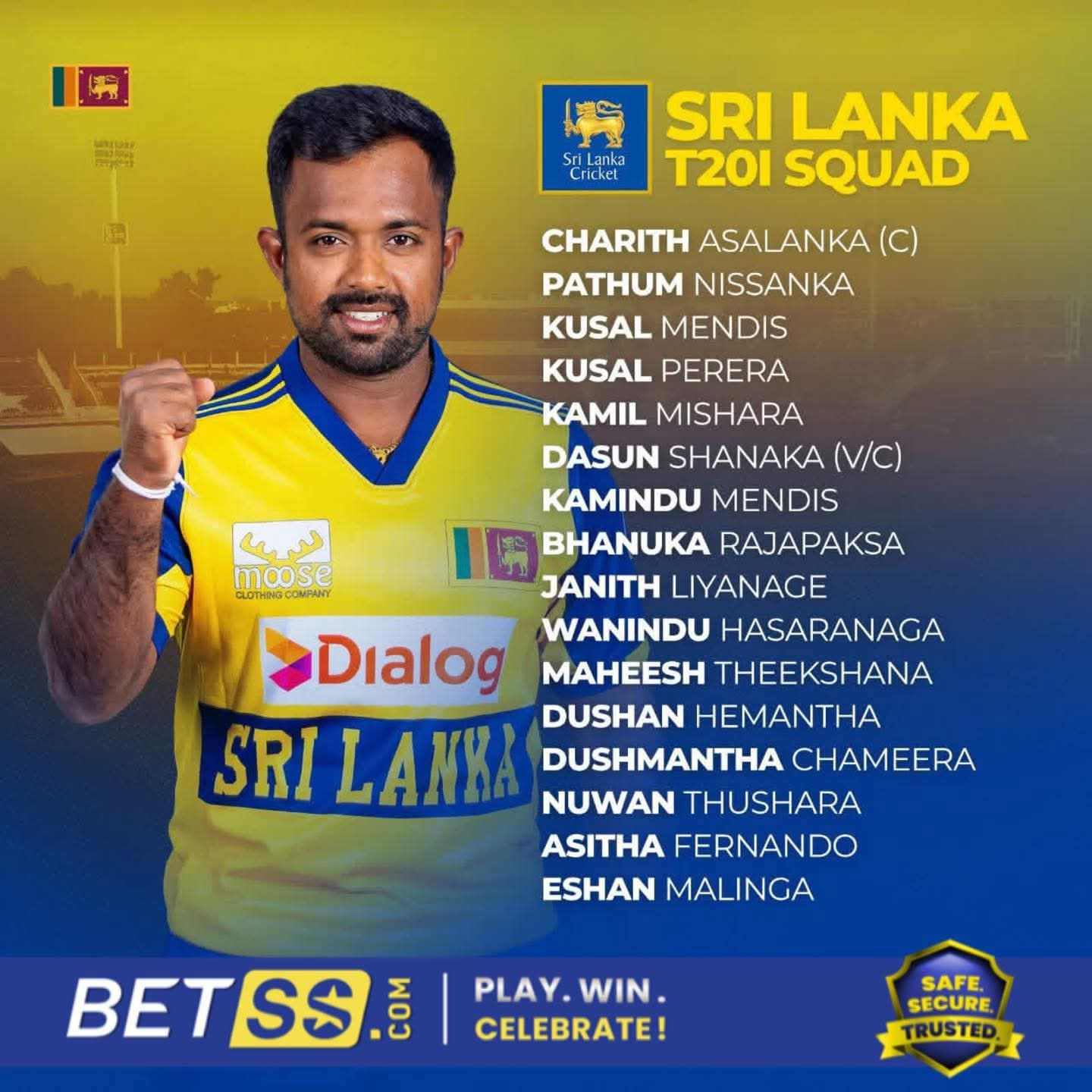 T20I squad: Charith Asalanka (C), Dasun Shanaka (VC) Pathum Nissanka, Kusal Mendis, Kusal Perera, Kamil Mishara, Kamindu Mendis, Bhanuka Rajapaksa, Janith Liyanage, Wanindu Hasaranga, Maheesh Theekshana, Dushan Hemantha, Dushmantha Chameera, Nuwan Thushara, Asitha Fernando, Eshan Malinga.