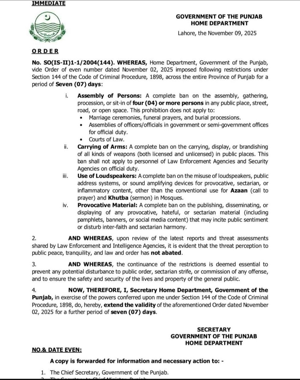 محکمہ داخلہ نے 15 نومبر تک دفعہ 144 کے نفاذ کا نوٹیفکیشن جاری کر دیا ہے اور عوامی آگاہی کے لیے بڑے پیمانے پر تشہیر کی ہدایت کی گئی ہے۔