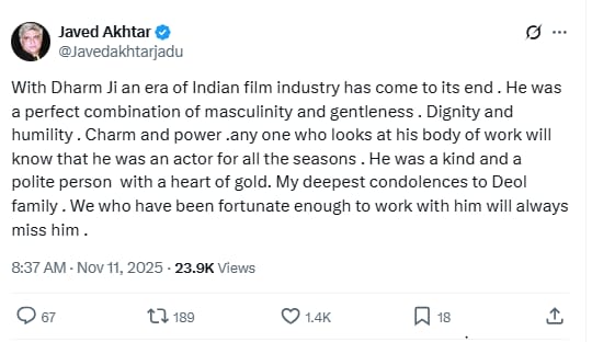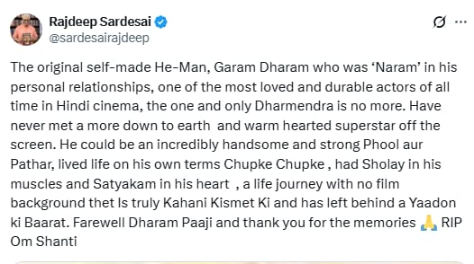 رپورٹس کے مطابق دھرمیندر کافی عرصے سے علیل تھے۔ پیر کی دوپہر انہیں طبیعت بگڑنے پر اسپتال کے انتہائی نگہداشت وارڈ (آئی سی یو) میں داخل کیا گیا تھا اور ڈاکٹروں نے انہیں وینٹی لیٹر پر منتقل کر دیا تھا۔ تاہم رات گئے وہ جانبر نہ ہو سکے۔ اتنا ہی نہیں بلکہ اس خبر کی تصدیق مختلف چینلز اور مشہور شخصیات نے بھی کی.