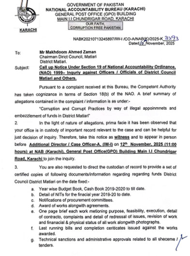 نیب نے چیئرمین ڈسٹرکٹ کونسل مٹیاری مخدوم احمد زماں کو خط لکھ دیا، انہیں ریکارڈ سمیت پیش ہونے کی ہدایت کردی گئی ہے۔