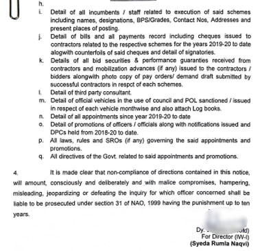نیب نے خط میں لکھا ہے کہ 2019 سے لے کر اس وقت تک جاری کیے گئے تمام ٹینڈرز کا ریکارڈ فراہم کیا جائے، منصوبوں کی ٹیکنیکل سینکشن اور ایڈمنسٹریشن اپروول پلان کی کاپی فراہم کی جائے، ترقیاتی کاموں کے ایگریمنٹ کاپی بھی فراہم کی جائے، ٹھیکے داروں کو ادا کی گئی رقم کی تفصیلات بھی فراہم کی جائے۔