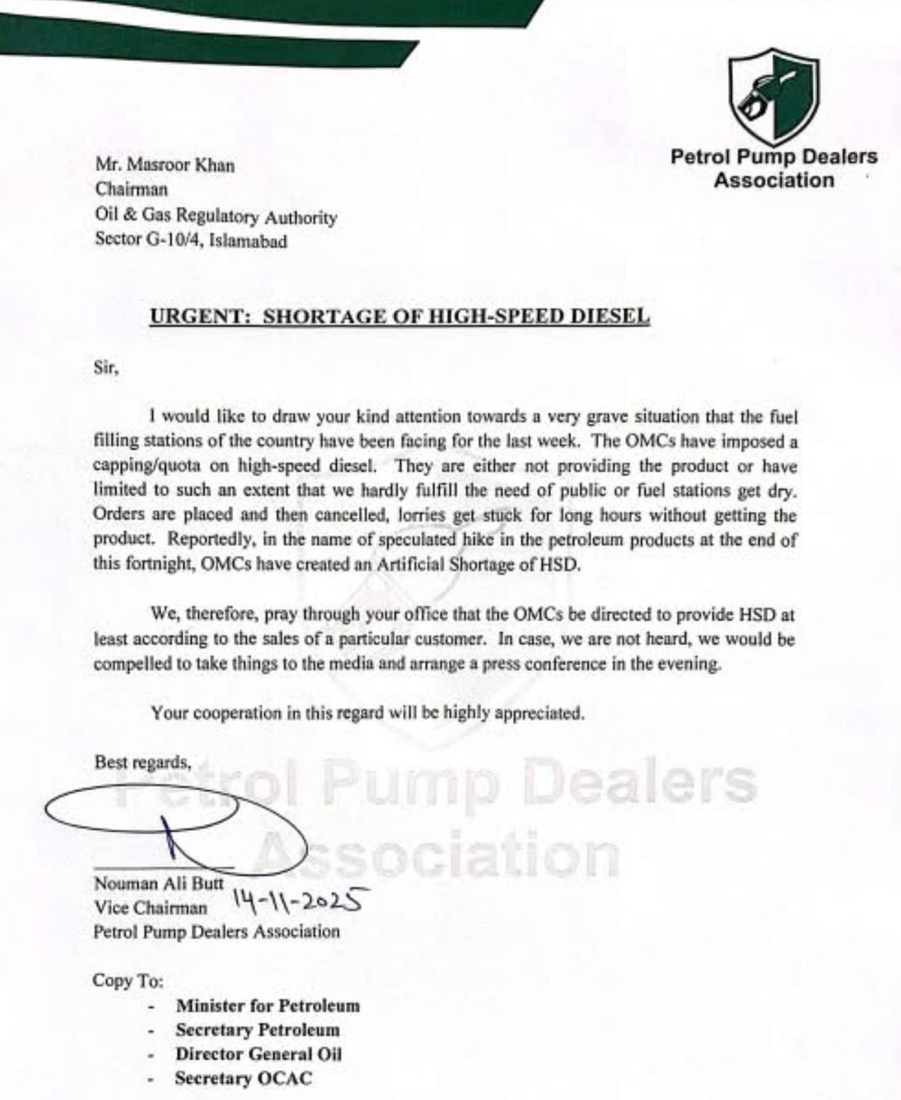 پیٹرول پمپ ڈیلرز ایسوسی ایشن کے وائس چیئرمین نعمان علی بٹ کی جانب سے چیئرمین اوگرا مسرور خان کو ایک خط ارسال کیا گیا ہے جس میں مؤقف اختیار کیا گیا ہے کہ گزشتہ ایک ہفتے سے آئل مارکیٹنگ کمپنیاں (OMCs) ڈیزل کی فراہمی پر کپنگ/کوٹہ لگا رہی ہیں، جس کے باعث پمپوں پر ایندھن کی شدید قلت پیدا ہوگئی ہے۔