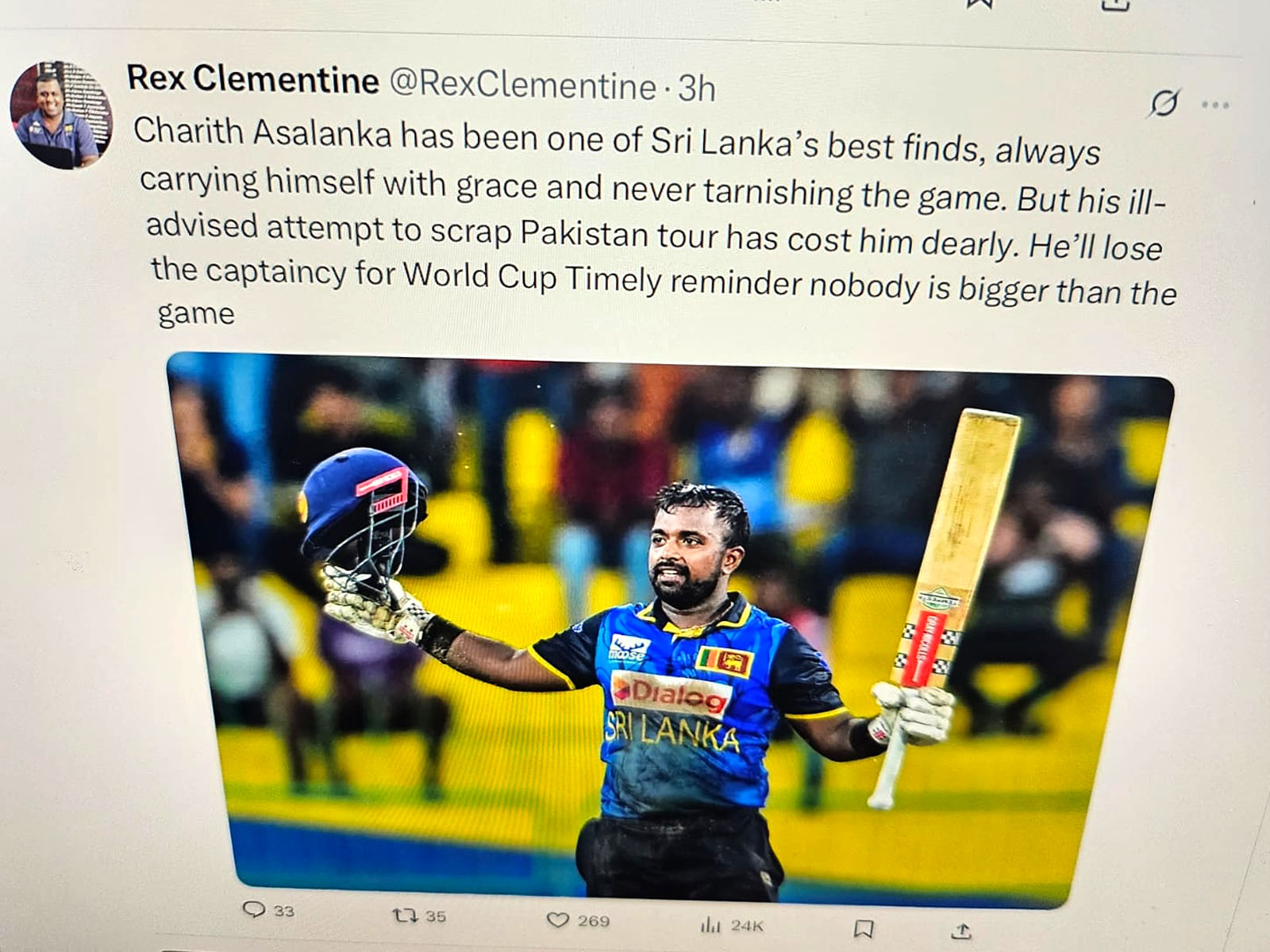 چارتھ اسالنکا جو اب سری لنکا واپس جا چکے ہیں اور ٹی ٹوئنٹی ٹرائی سیریز میں حصہ نہیں لے رہے اور ان کی جگہ dasun شنکا کو کپتانی دی گئی ہے سری لنکن کرکٹ بورڈ کے سامنے پیش ہوں گے اور پھر فیصلہ ہوگا کہ کیا ان پہ تادیبی کارروائی کی جائے اور کپتان برقرار رکھا جائے یا نہیں۔
