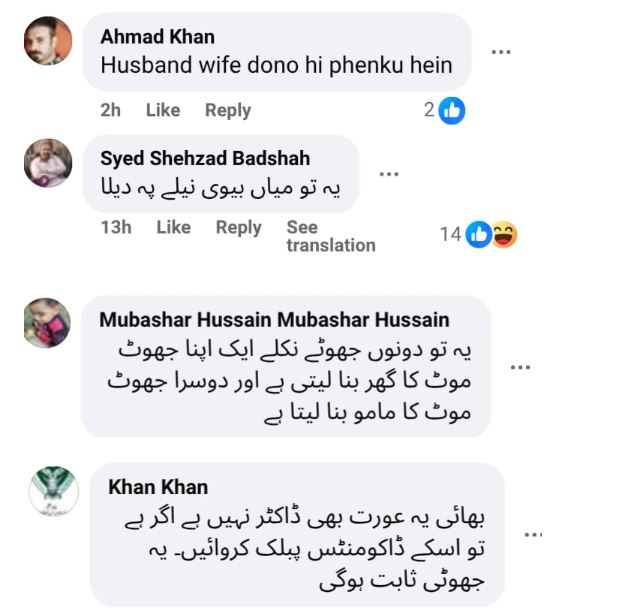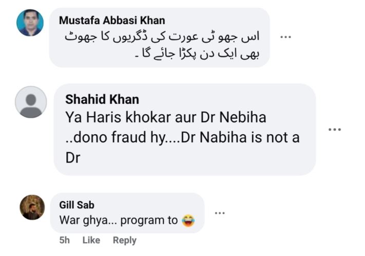 ایک اور صارف نے کہا نبیہہ کی ڈگریاں بھی چیک کرنی چاہیے، وہ ڈاکٹر بھی نہیں ہیں۔ کئی صارفین نے دونوں کو جھوٹا قرار دیا اور سوال کیا کہ کیا یہ جوڑا سچائی سے کتنے دور ہے۔