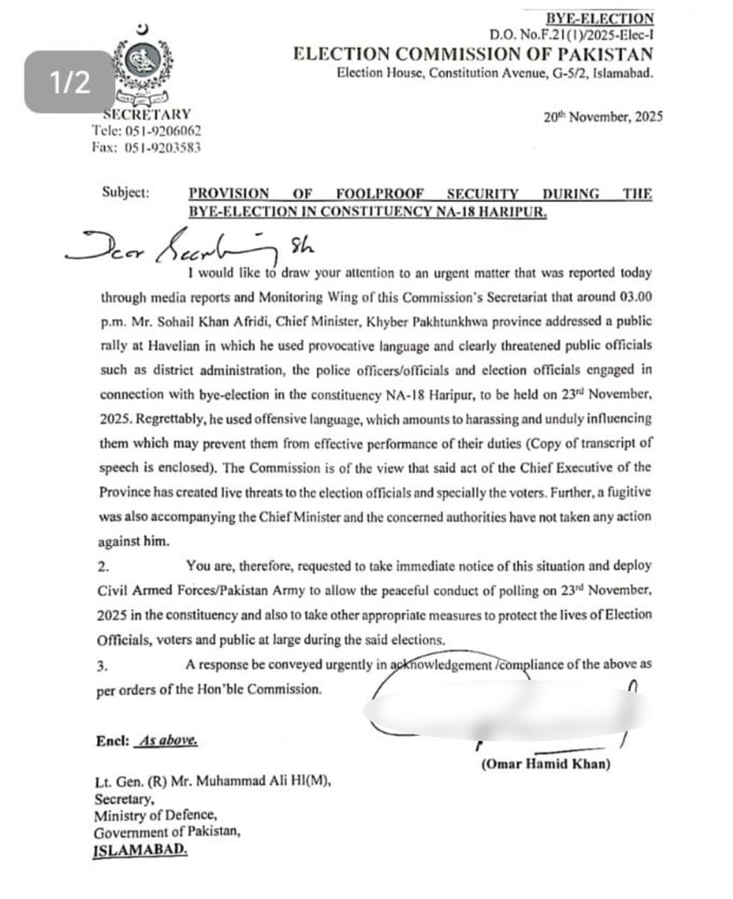 الیکشن کمیشن آف پاکستان نے این اے 18 ہری پور کے ضمنی انتخابات کے دوران فول پروف سیکیورٹی یقینی بنانے کے لیے پاک فوج اور سول آرمڈ فورسز کو طلب کرلیا ہے۔