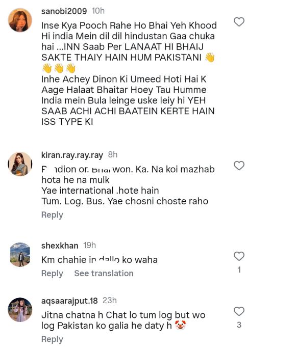 ایک اور صارف نے تنقید کرتے ہوئے کہا کہ کس سے پوچھ رہے ہو؟ یہ وہی بندہ ہے جس نے بھارت میں ‘دل دل ہندوستان گایا تھا۔ اپنی بیوی کو لے کر انڈیا چلے جاؤ۔