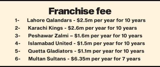 پاکستان سپر لیگ کو لاکھوں کرکٹ شائقین نے صرف پاکستان میں نہیں بلکہ دنیا بھر میں بڑی دلچسپی سے فالو کرتے ہیں۔ آج کل جو سب سے بڑا سوال پی ایس ایل کو لے کر شائقین کے ذہن میں ہے، وہ یہ ہے کہ جو چھ فرنچائزز پی ایس این میں کھیل رہی ہیں اور جو دو نئی فرنچائزز اگلے سال کے لیے شامل ہونی ہے ان کی اب اگلے 10 سال کے لیے کیا فرنچائز فیس ہوگی۔