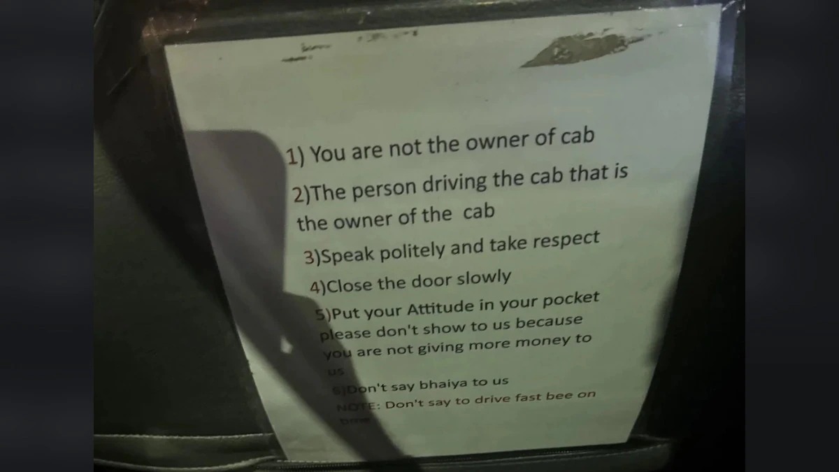 بنگلورو کی ایک ٹیکسی ڈرائیور نے گاڑی میں 6 ایسے اصول ٹائپ کروا کے لگا دیے ہیں جس کی تصویر ایک ریڈٹ صارف نے شیئر کی اور یہ فوراؐ سوشل میڈیا پر مشہور ہو گئی۔ اس بورڈ پر ڈرائیور نے صاف الفاظ میں بتایا تھا کہ مسافروں کو اس کے ساتھ کیسا سلوک کرنا چاہیے۔ ان اصولوں نے لوگوں کے درمیان یہ بحث شروع کر دی کہ کیب ڈرائیورز کا احترام کرنا کتنا ضروری ہے۔