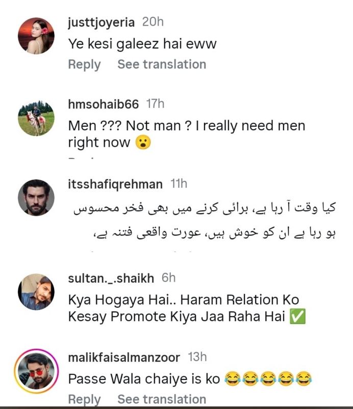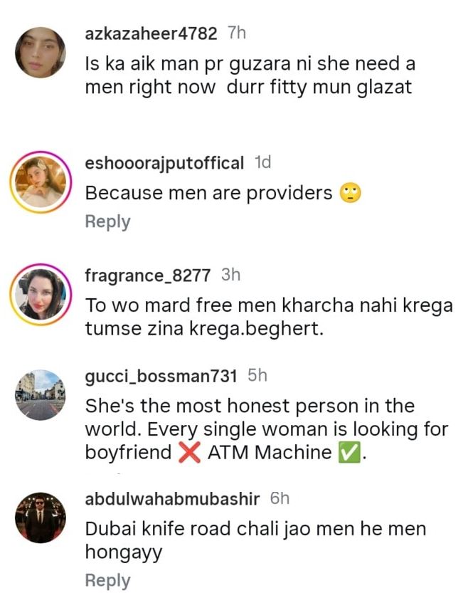 کچھ نے کہا کہ کوئی بھی مفت میں خرچ نہیں کرے گا بدلے میں حرام تعلق کی توقع ہوگی۔دوسروں نے تنقید کی کہ ایسی باتیں معاشرے پر منفی اثر ڈالتی ہیں اور کچھ نے سادہ الفاظ میں کہا اسے امیر لڑکے کی ضرورت ہے۔