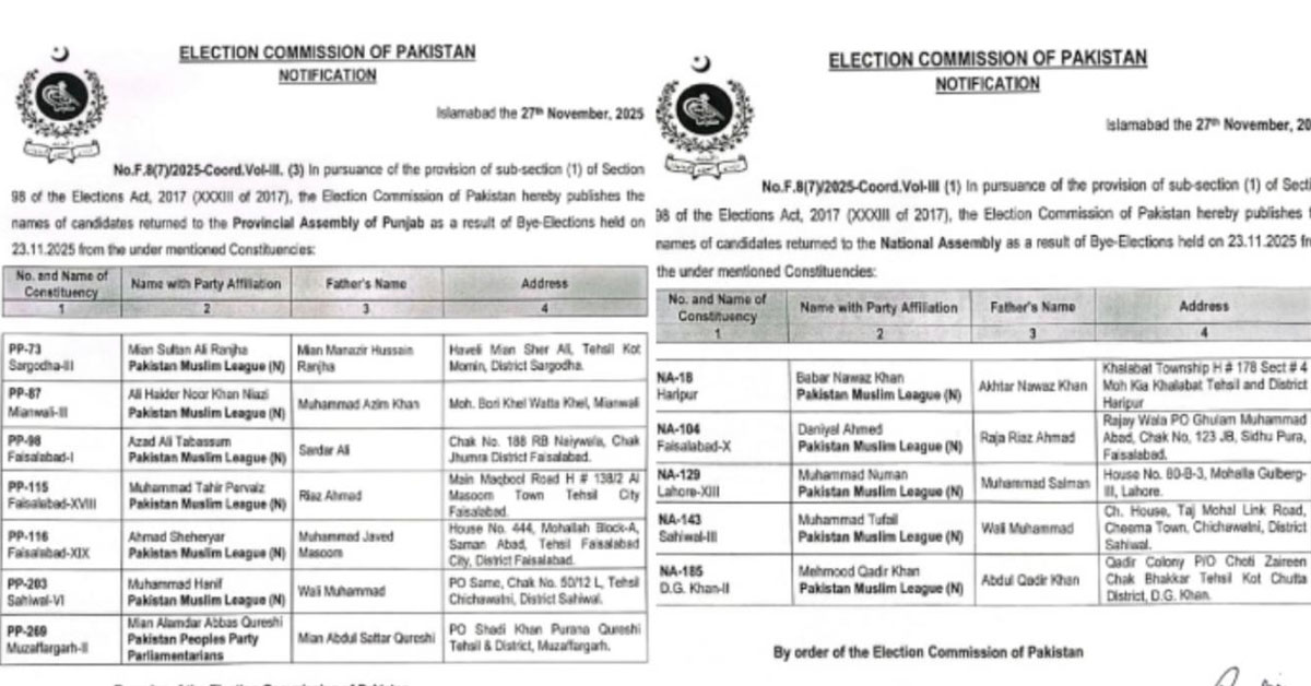 نوٹیفکیشن کے مطابق این اے 18 ہری پور سے بابر نواز خان کامیاب ہوئے، این اے 104 فیصل آباد سے دانیال احمد،این اے 129 لاہور سے محمد نعمان کی کامیابی کا نوٹیفکیشن جاری ہوا،این اے 143 ساہیوال سے محمد طفیل این اے 185 ڈیرہ غازی خان سے محمود قادر خان کامیاب ہوئے۔ تاہم این اے 96 فیصل آباد سے بلال بدر کامیاب ہوئے، لیکن ضابطہ اخلاق کی خلاف ورزی کے باعث ان کا نوٹیفکیشن فی الحال روکا گیا ہے۔
