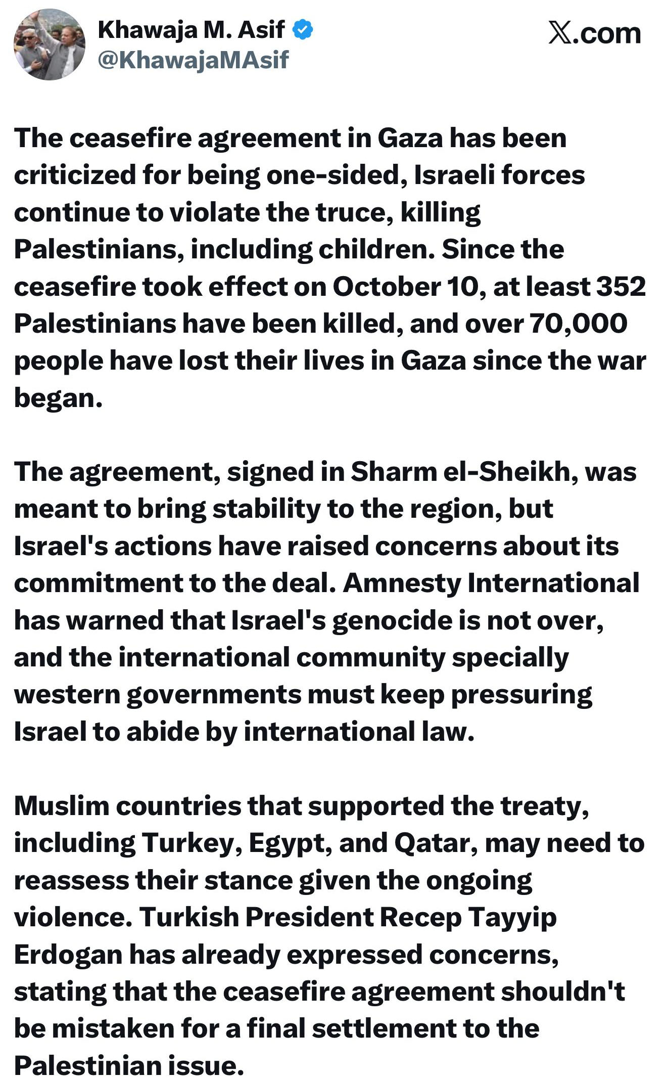 پاکستان کے وزیرِ دفاع نے غزہ میں جنگ بندی معاہدے کو یکطرفہ اور غیر مؤثر قرار دیتے ہوئے کہا ہے کہ اسرائیلی فورسز مسلسل خلاف ورزیوں کے ذریعے نہتے فلسطینیوں کو نشانہ بنا رہی ہیں، جن میں معصوم بچے بھی شامل ہیں۔