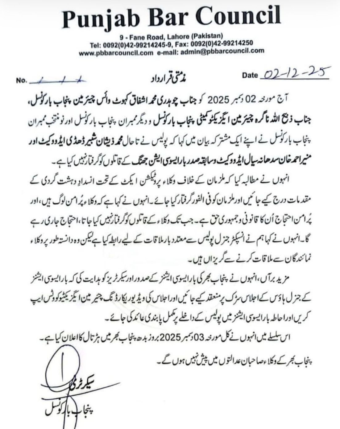 مزید برآں پنجاب بھر کی تمام بار ایسوسی ایشنز سے کہا گیا ہے کہ وہ اپنے دفاتر اور بار رومز میں پولیس کا داخلہ مکمل طور پر بند کردیں۔ تمام وکلا کو ہدایات جاری کی گئی ہیں کہ وہ پولیس کے ساتھ کسی بھی ملاقات یا تعاون سے پہلے بار کونسل کو مطلع کریں۔ اس صورتحال کے پیش نظر پنجاب بھر کی بار ایسوسی ایشنز نے 3 دسمبر 2025 کو صوبہ بھر میں مکمل ہڑتال کا اعلان کیا ہے۔