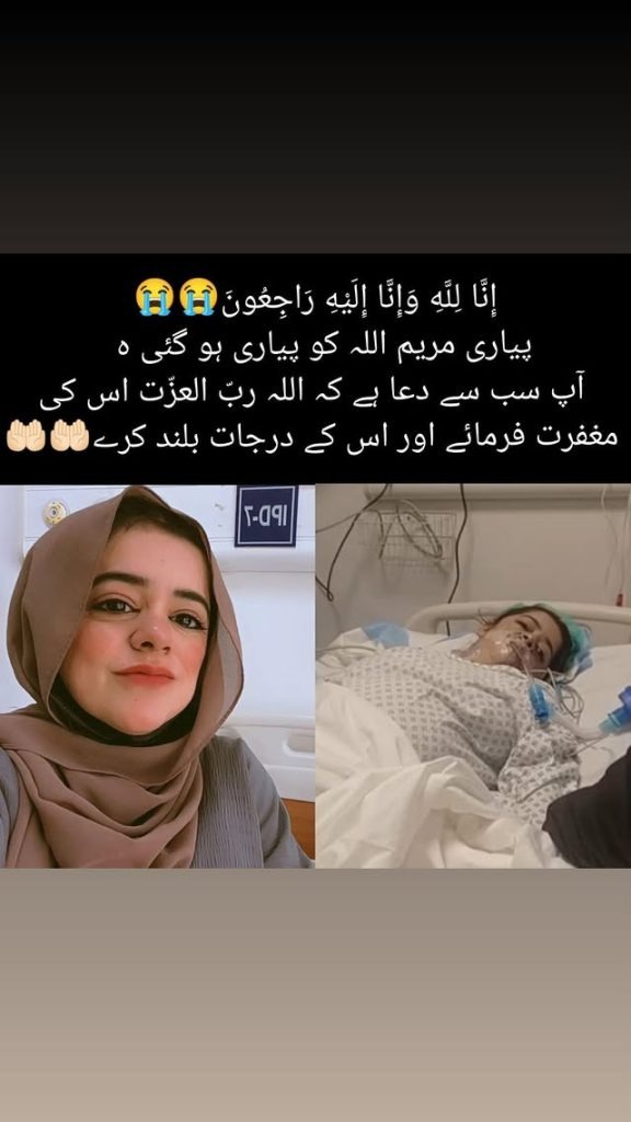 اہلِ خانہ نے ایک جذباتی پیغام میں تصدیق کی کہ پیاری مریم بچے کی پیدائش کے فوراً بعد چل بسیں۔ ان کے بیان میں لکھا گیا: “إِنَّا لِلّهِ وَإِنَّـا إِلَيْهِ رَاجِعونَ… پیاری مریم اللہ کو پیاری ہو گئی ہیں۔” انہوں نے عوام سے مرحومہ کے لیے مغفرت اور بلند درجات کی دعا کی درخواست بھی کی۔
