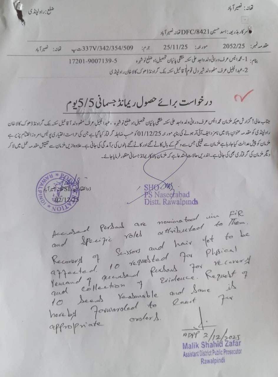 جوڈیشل مجسٹریٹ صوفیہ ملک نے لڑکی کے بال کاٹنے کے کیس میں ملزمان جلیل اور جبار کو 14 روزہ جوڈیشل ریمانڈ پر اڈیالہ جیل بھیجنے کا حکم دے دیا۔