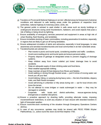 اس حوالے سے متعلقہ اداروں کو ایمرجنسی سروسز اور ضروری اشیاء کی دستیابی یقینی بنانے کی ہدایت بھی کی گئی ہے، جبکہ عوام سے اپیل کی گئی ہے کہ وہ خراب موسم میں غیر ضروری سفر سے اجتناب برتیں۔