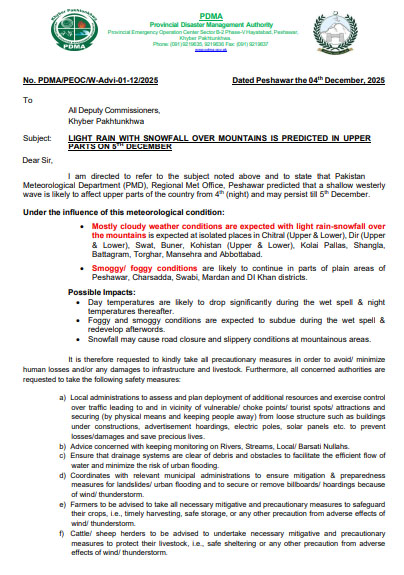 پی ڈی ایم اے کے مطابق 4 سے 5 دسمبر کو مختلف اضلاع میں وقفے وقفے سے بارش اور بالائی علاقوں میں برفباری کا امکان ہے، اس دوران ضلعی انتظامیہ کی جانب سے پیشگی اقدامات یقینی بنانے کی ہدایت کر دی گئی ہے۔