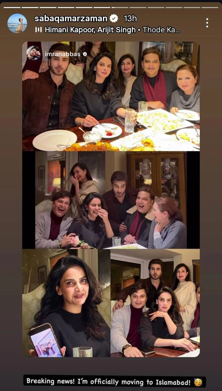 حال ہی میں میزبان عاصم یار کی جانب سے مختلف شوبز شخصیات کے لیے منعقدہ عشائیے میں اداکار عمران عباس بھی موجود تھے۔ صبا قمر نے عمران عباس کی انسٹاگرام اسٹوری کو ری شیئر کرتے ہوئے باقاعدہ اعلان کیا کہ وہ اسلام آباد منتقل ہو رہی ہیں جس کے بعد ان کے مداحوں میں تجسس اور خوشی کا ملا جلا ردعمل سامنے آیا۔