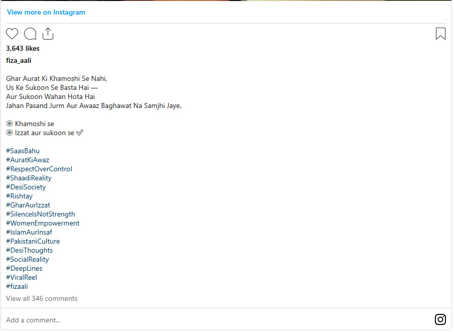 فضا علی اور مامیا شجفر صبا سے متفق نہیں ہیں۔ فضا علی نے اپنے انسٹاگرام پر لکھا کہ ایک گھر بہت اچھا ہوتا ہے جب اس میں رہنے والی عورت سکون میں ہو۔ فیصلے مل کر کرنے چاہئیں اور باہمی احترام اور محبت کی ضرورت ہے۔ اگر عورت کو "امن" برقرار رکھنے کے لیے خاموش رہنا پڑے تو وہ گھر نہیں ہے۔