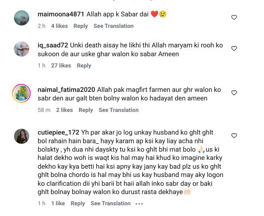 سوشل میڈیا صارفین احسان علی اور ان کے خاندان کے ساتھ دکھ اور ہمدردی کا اظہار کر رہے ہیں۔ کئی صارفین نے لکھا کہ وہ جنت میں ہوں گی کیونکہ وہ بچوں کی پیدائش کے دوران وفات پا گئیں۔