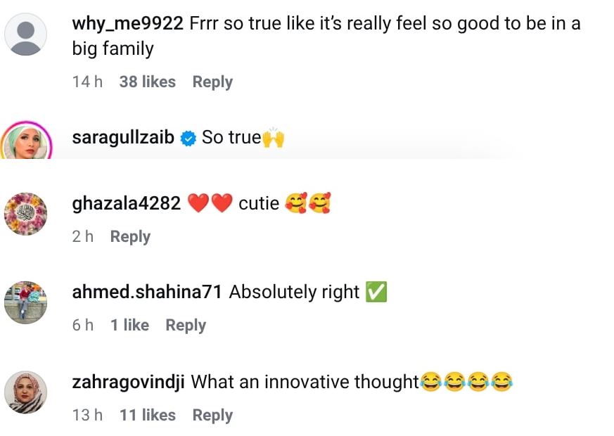 سوشل میڈیا پر اقراء عزیز کے خیالات پر مداح مثبت ردعمل دے رہے ہیں۔ ایک صارف نے لکھا بڑے خاندان میں ہونا واقعی بہت اچھا ہے جبکہ دوسرے نے کہا آپ بالکل درست کہہ رہی ہیں اور ایک نے کہا کتنی منفرد اور جدید سوچ ہے۔