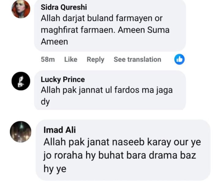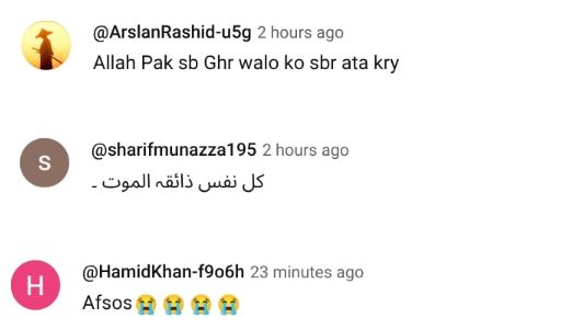ایک صارف نے لکھا ’’اللہ تعالیٰ مرحوم کو جنت الفردوس میں اعلیٰ مقام عطا فرمائے۔‘‘ جبکہ دوسرے نے کہا، ’’اپنے قریبی دوست کو کھونا ناقابلِ بیان درد ہوتا ہے۔‘‘