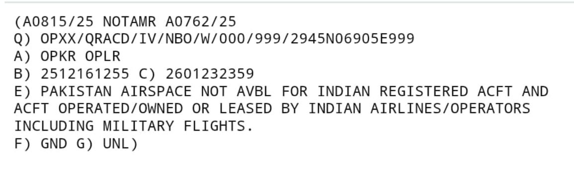 پی اے اے کے جاری کردہ نوٹم میں واضح کیا گیا ہے کہ اس بندش کا اطلاق بھارتی ایئرلائنز کے زیرِ ملکیت، آپریٹ یا لیز پر لیے گئے تمام طیاروں پر ہوگا جن میں فوجی پروازیں بھی شامل ہیں۔