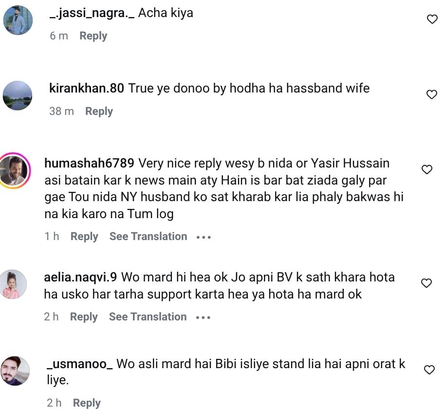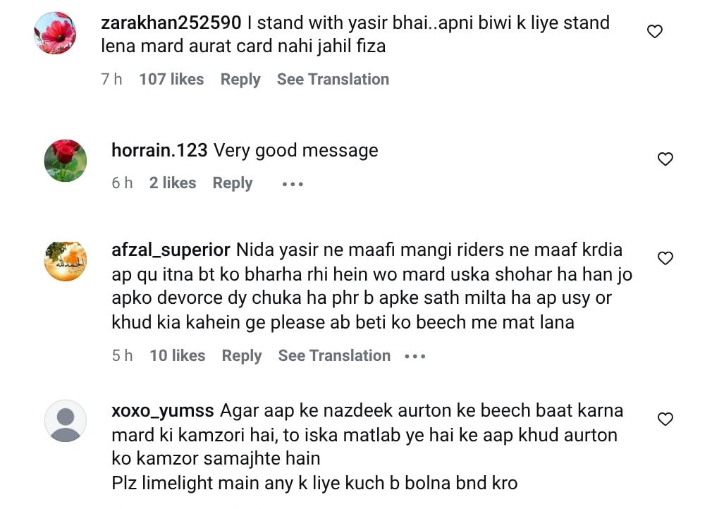 اس پر یاسر نواز نے اپنی اہلیہ کے حق میں بیان دیتے ہوئے کہا تھا کہ فضا علی بلاوجہ ندا یاسر کے پیچھے پڑی ہوئی ہیں۔