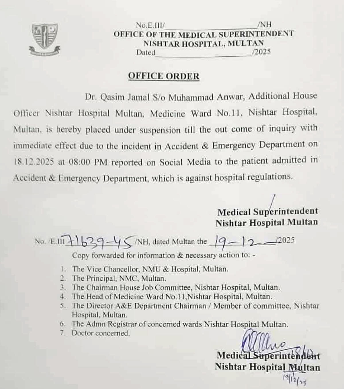 نشتر اسپتال ملتان کے ایک ڈاکٹر کی سوشل میڈیا پر نازیبا حرکت کی ویڈیو وائرل ہونے کے بعد انتظامیہ نے فوری کارروائی کی ہے۔