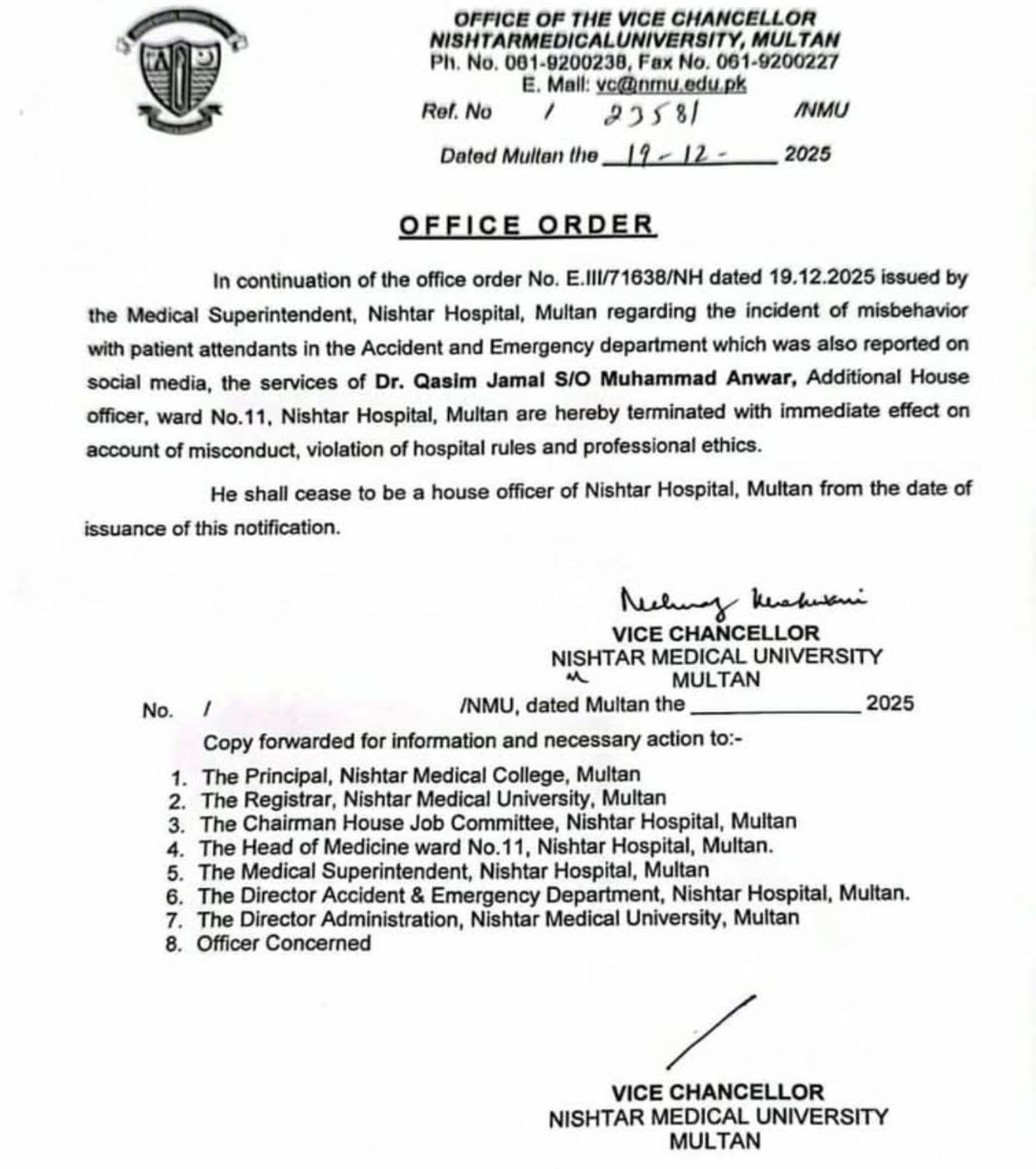 وائس چانسلر نشتر میڈیکل یونیورسٹی، پروفیسر ڈاکٹر مہناز خاکوانی کے حکم پر ڈاکٹر جمال قاسم کو نشتر اسپتال ملتان سے معطل کرنے کے بعد آج برطرف کردیا گیا۔