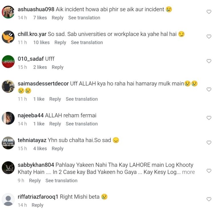 مشی خان نے کہا کہ یہ یونیورسٹی میں دوسرا ایسا واقعہ ہے جہاں طلبہ عمارت سے گر کر اپنی جانیں کھو رہے ہیں۔ یونیورسٹی انتظامیہ کے خلاف کھلی تحقیقات ہونی چاہئیں تاکہ یہ معلوم ہو سکے کہ وہ طلبہ پر کس قسم کا دباؤ ڈال رہے ہیں جو انہیں انتہائی قدم اٹھانے پر مجبور کر رہا ہے۔ اس لڑکی کا تعلق شیخوپورہ سے تھا۔ میں ان والدین پر بھی غصہ ہوں جو اپنے بچوں کو ایسی یونیورسٹیوں میں بھیجتے ہیں جہاں طلبہ اپنی جان لے رہے ہیں۔ پہلے واقعے کے بعد انہوں نے شام میں میلہ بھی رکھا تھا۔ والدین پر شرم آنی چاہیے۔ میں پنجاب حکومت سے اپیل کرتی ہوں کہ ان واقعات کی کھلی تحقیقات کرے۔
