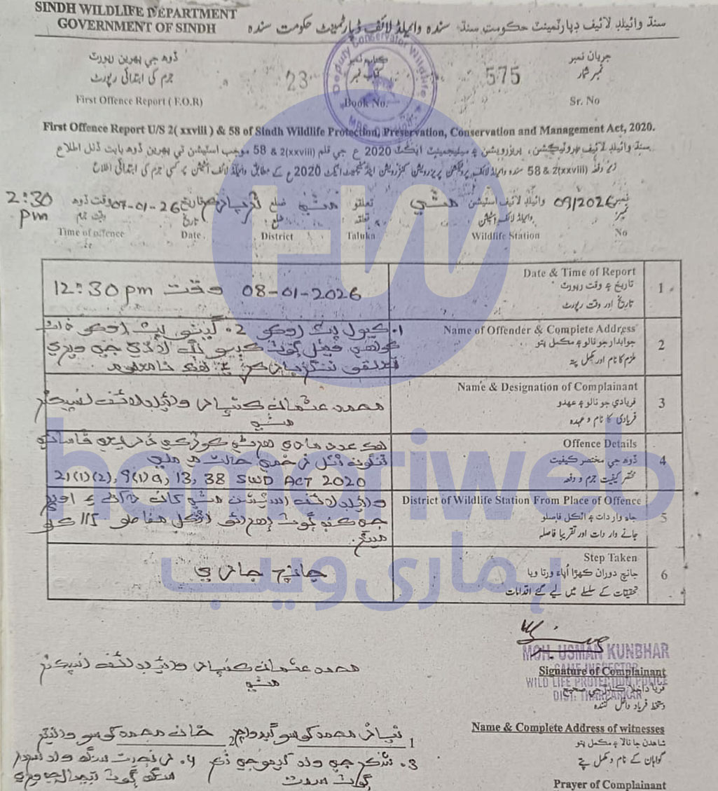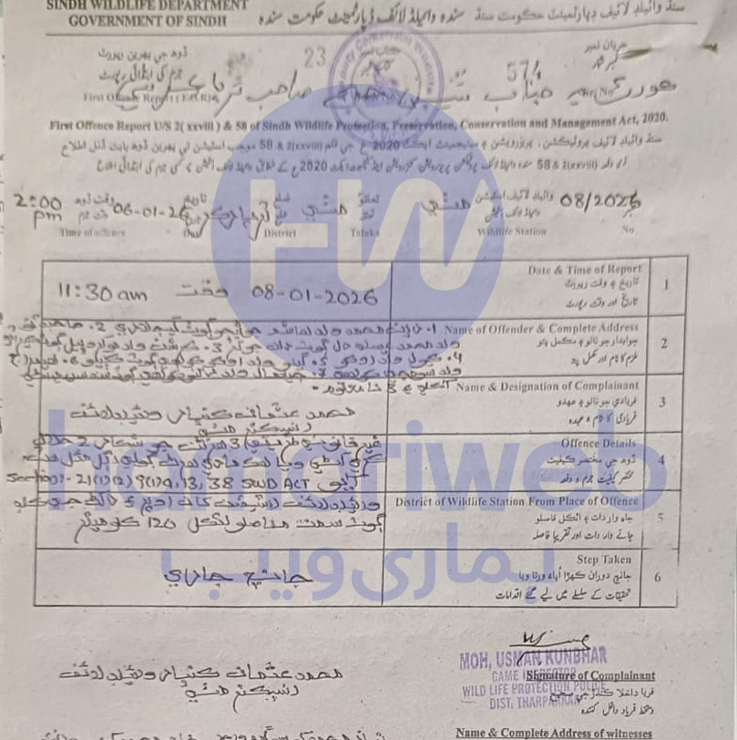ننگر پارکر میں کوڑکی لگا کر مادہ ہرن کا شکار کرنے پر سندھ وائلڈ لائف پروٹیکشن ایکٹ 2020 کے تحت سندھ وائلڈ لائف پروٹیکشن پولیس اسٹیشن مٹھی میں انسپیکٹر محمد عثمان کی مدعیت میں کیول ولد اوکو اور گینو ولد اوکو کے خلاف فوجداری مقدمہ درج کرلیا گیا۔