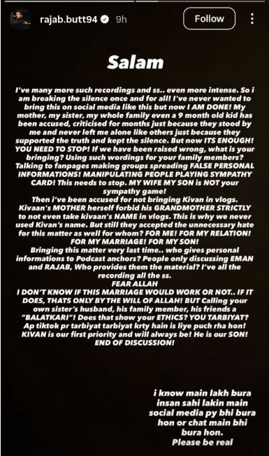 یوٹیوبر نے وضاحت دی کہ ان کے بیٹے کیوان کو وی لاگز میں شامل نہ کرنے کا فیصلہ خود ان کی اہلیہ کا تھا اس کے باوجود انہیں اس معاملے پر بھی تنقید کا سامنا کرنا پڑا۔ رجب بٹ نے کہا کہ ان کی شادی چلے گی یا نہیں یہ اللہ کی مرضی ہے لیکن ذاتی تعلقات کو اس طرح اچھالنا اور الزامات لگانا اخلاقیات کے خلاف ہے۔