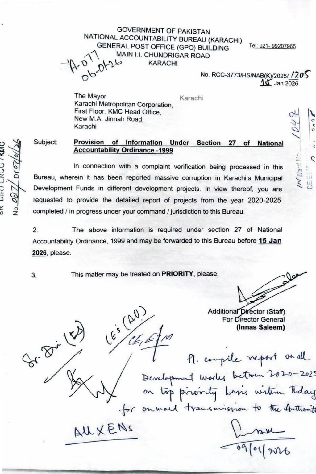 یاد رہے کہ نیب کراچی نے مئیر کراچی سے 2020 سے 2025 کے دوران ڈیولپمنٹ ورکس کی تفصیلات طلب کی ہیں، نیب کے مطابق کے ایم سی ڈیولپمنٹ پروجیکٹس میں میگا کرپشن کی شکایت موصول ہوئی ہیں، مئیر کراچی سے 2020 سے 2025 کے دوران مکمل کیے گیے پروجیکٹس یا جن پر کام جاری ہے ان کی مکمل تفصیلات مانگی گئی ہیں۔
